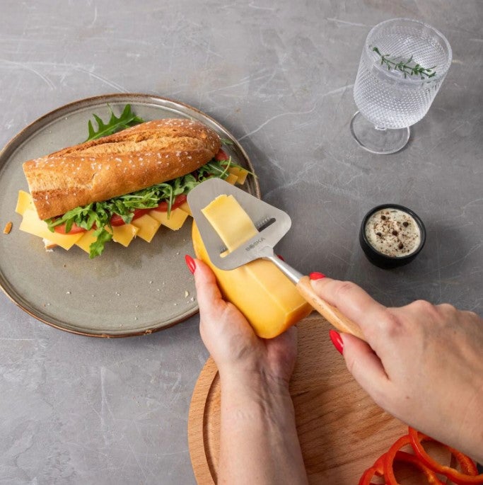 Ruostumatomasta teräksestä valmistettu juustohöylä koville ja puolikoville juustoille.