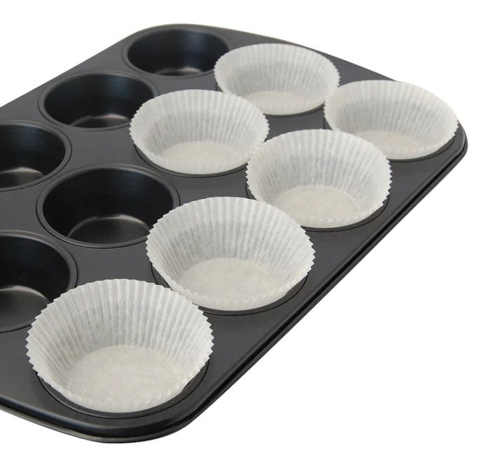 Teräksinen 12 reikäinen muffinssivuoka, jossa tarttuvuutta ehkäisevä pinnoite.
