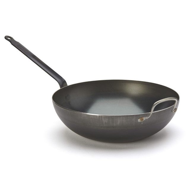 de Buyer hiiliteräksinen wokkipannu vihannesten paistamiseen ja esim. öljypohjaiseen pastakastikkeeseen.