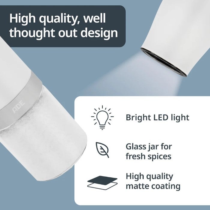 Sähköinen suola- ja pippurimylly saksalaiselta Adelta jauhaa täydellisesti annosteltuja mausteita, tuoreena jauhettua, ilman edes napin painalusta.