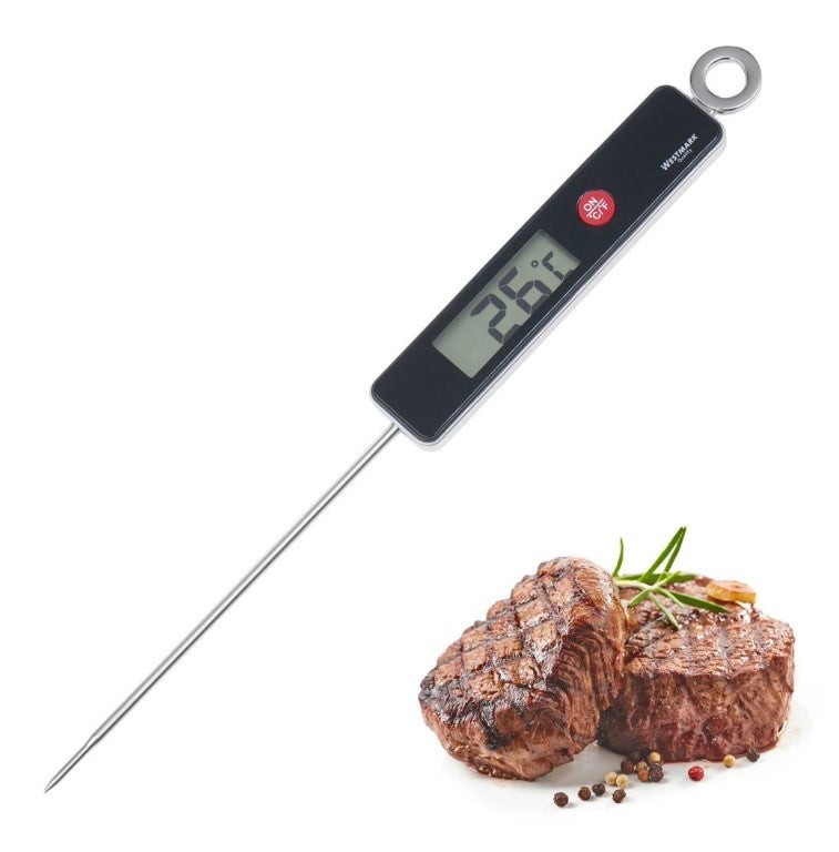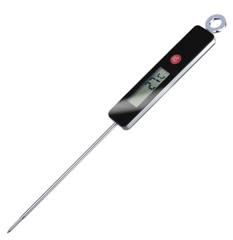 Pitkä digitaalinen lämpömittari ruokien ja juomien lämpötilan mittaukseen.