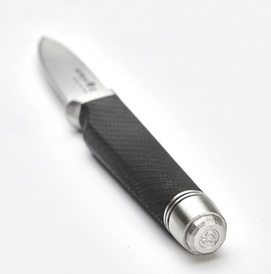 Korkealaatuisesta ruostumattomasta teräksestä valmistettu kuorimaveitsi hiilikuitukahvalla.