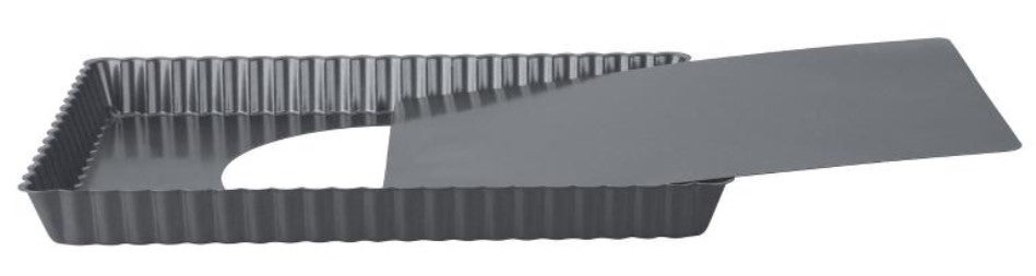 Pinnoitettu peltinen piirakkavuoka, jossa kypsän piiraan irroittamista helpottava nostettava irtopohja.