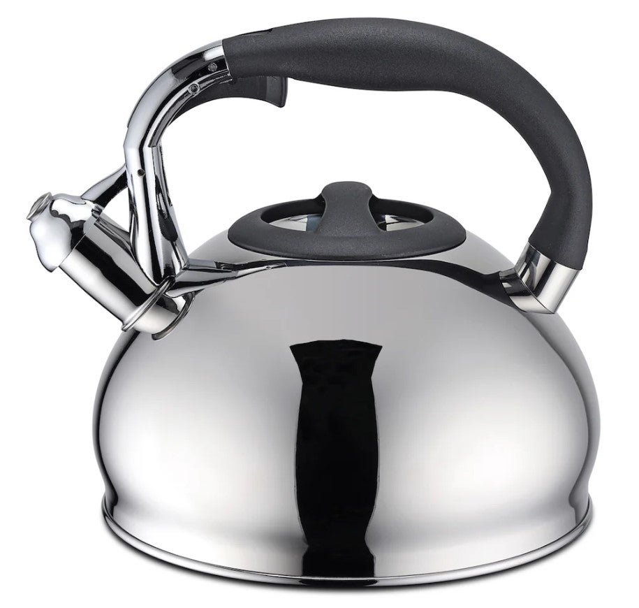 Korkealaatuisesta ruostumattomasta teräksestä valmistettu viheltävä vesipannu kerrospohjalla.