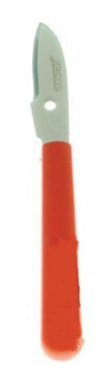 Perinteinen punakahvainen rapuveitsi, jossa ruostumattomasta teräksestä valmistettu reiällinen teräosa.