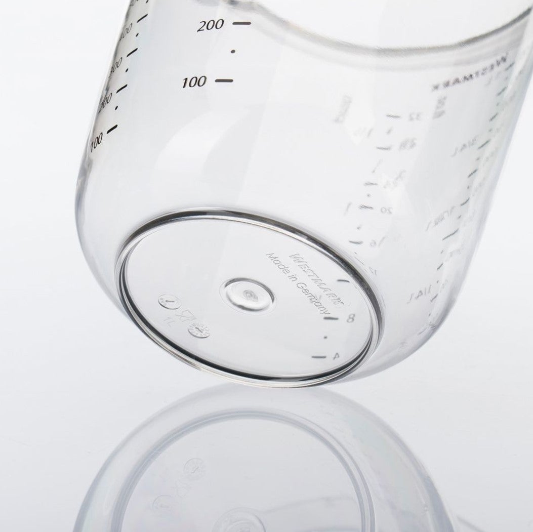 Asteikot myös sokerille ja jauhoille grammoissa. Kyljessä millilitrat 100-500 ml sekä pintit 4-16. Kannun voi pestä astianpesukoneessa sekä sitä voi käyttää lämmittämiseen mikrossa.