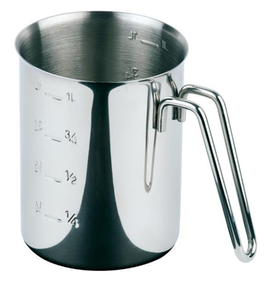 Ruostumattomastä teräksestä valmistettu sauvasekoitinkulho mitta-asteikolla.
