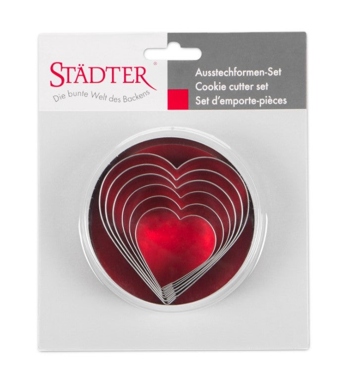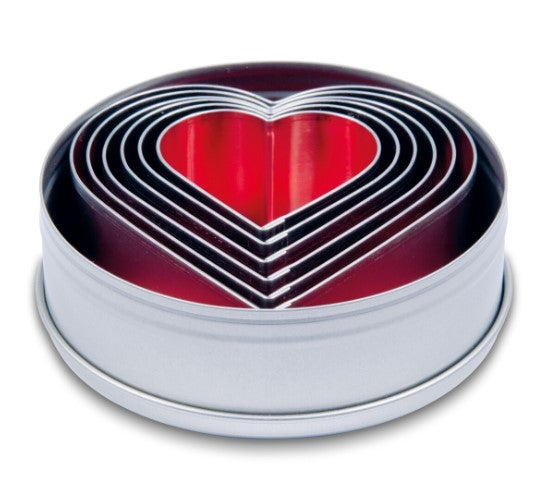 Pellistä valmistettu muottisarja, jossa 6 sydämen muotoista muottia.